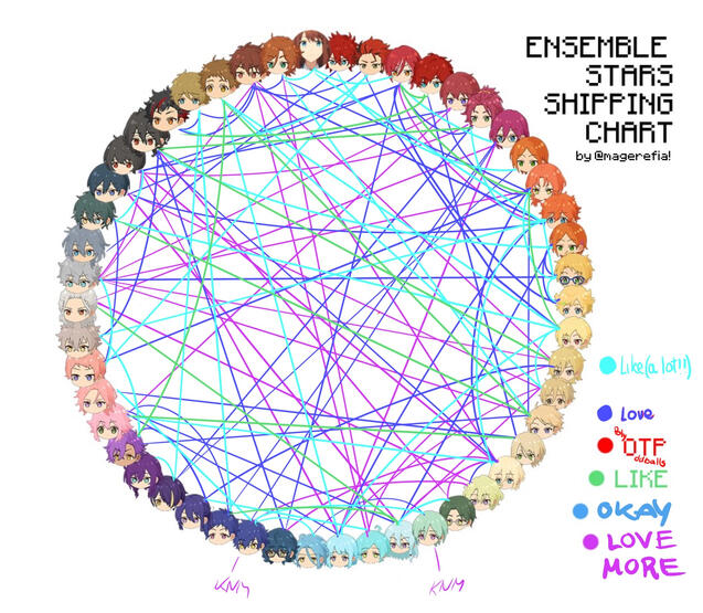 Enstars: (I think I like almost every famous ship so I’ll set that aside) Subanatsu, Polyoddballs ( + every combination), Shuleo, Natsuleo, Tomohoku, Tomowata, Watahoku, Eiritsu, Chiaizu, Shuizu, Natsuhokke, Eichia… Etc. I’m a multishipper + it’s weird for me to have NOTPs, so feel free to talk to me about anything! If you’re bored, you can check an outdated, messy and confusing shipping chart I made here. They’re not all but mostly.